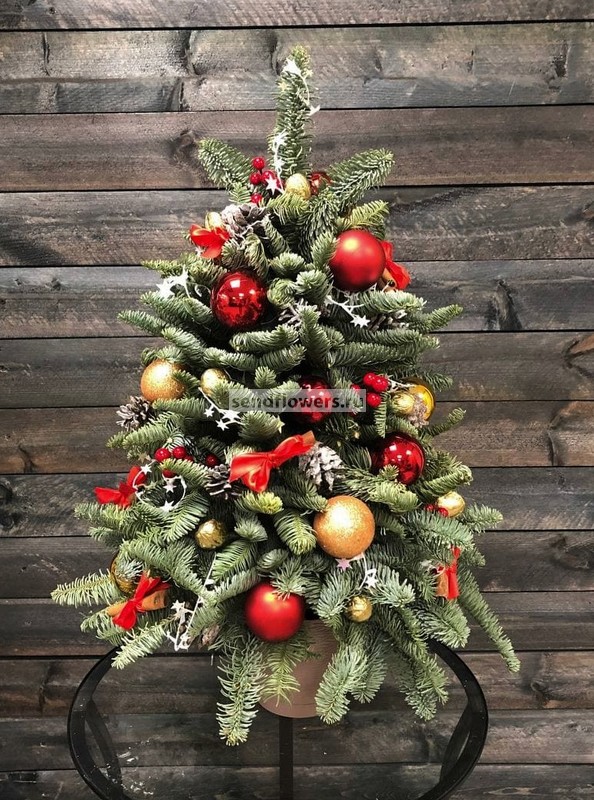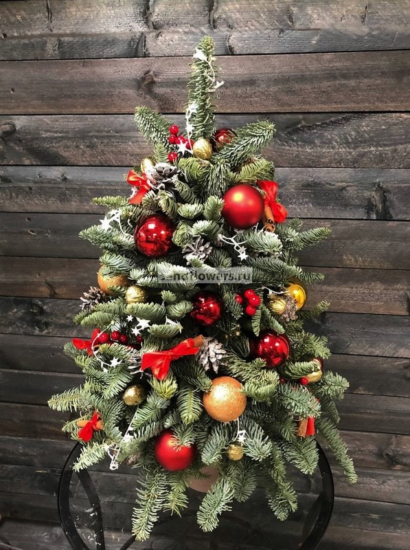 Состав: Нобилис - 7, Кашпо пластик - 1, Оазис - 2, Новогодний шар - 17, Шишка - 18, Орех - 15, Ягода декоративная - 9, Корица - 15, Мишура - 20, Искусственный снег. Высота - 70 см, ширина - 50 см.