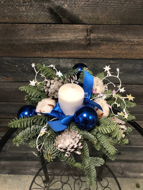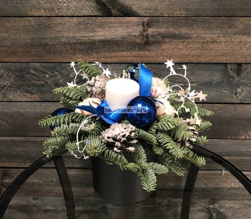 Состав: Шар новогодний - 3, Шишка - 5, Хлопок - 3, Свеча - 1, Бант - 3, Мишура - 7, Искусственный снег , Шляпная коробка - 1, Оазис - 1, Нобилис - 1.