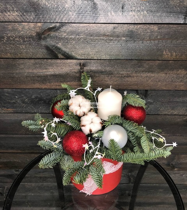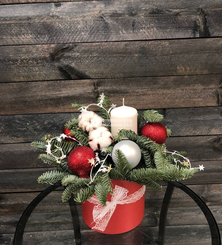 Состав: Шляпная кробка - 1, Кружево - 1, Нобилис - 1, Оазис - 1, Свеча - 1, Шар новогодний - 5, Хлопок - 2, Мишура - 7.