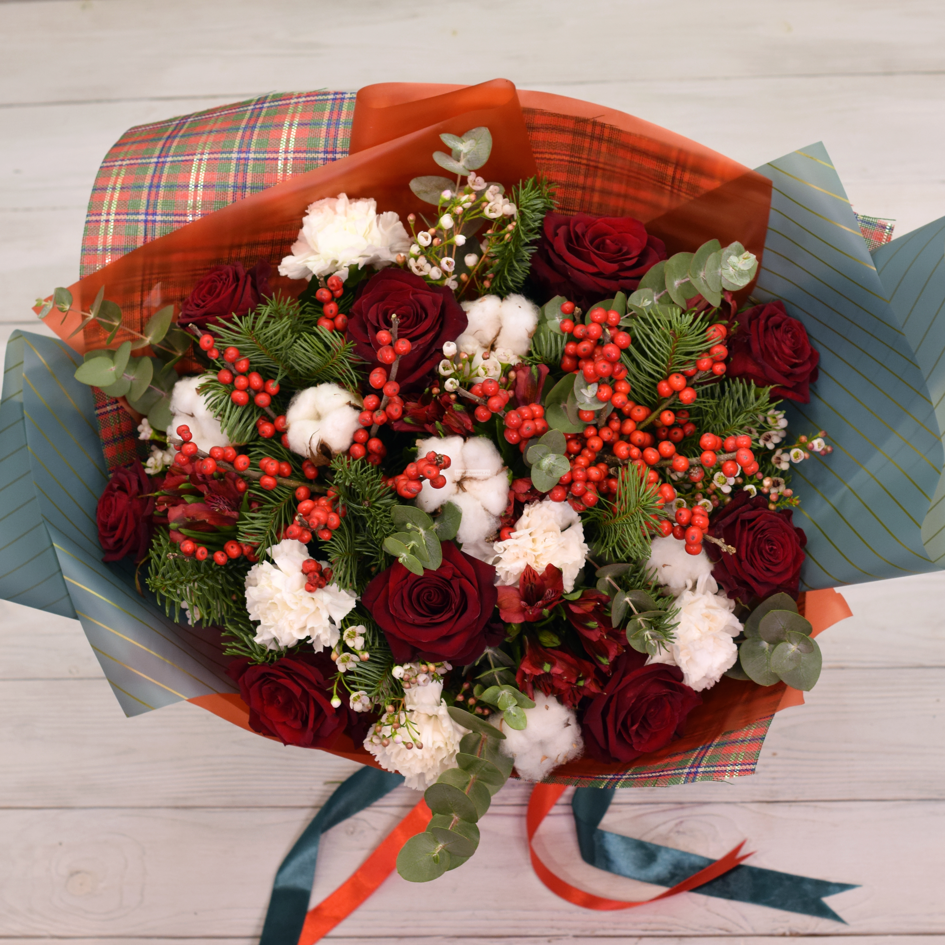Состав: розы красные - 9 шт., белая гвоздика - 5 шт., хлопок - 6 шт., илекс - 4 шт., альстромерия красная - 3 шт., воксфлауэр белый - 6 шт., ель нобилис, эвкалипт. Размер: высота - 50 см., диаметр - 50 см.