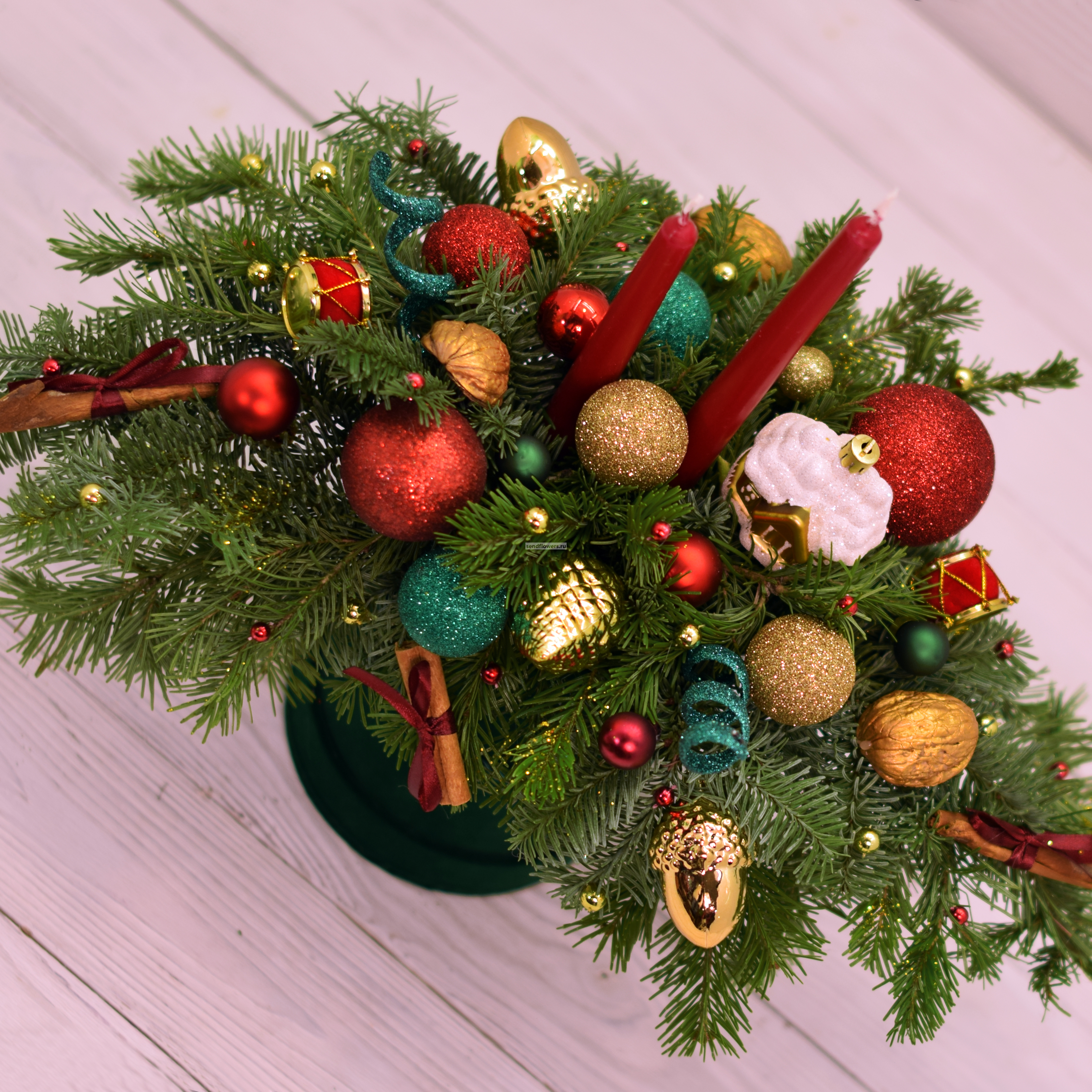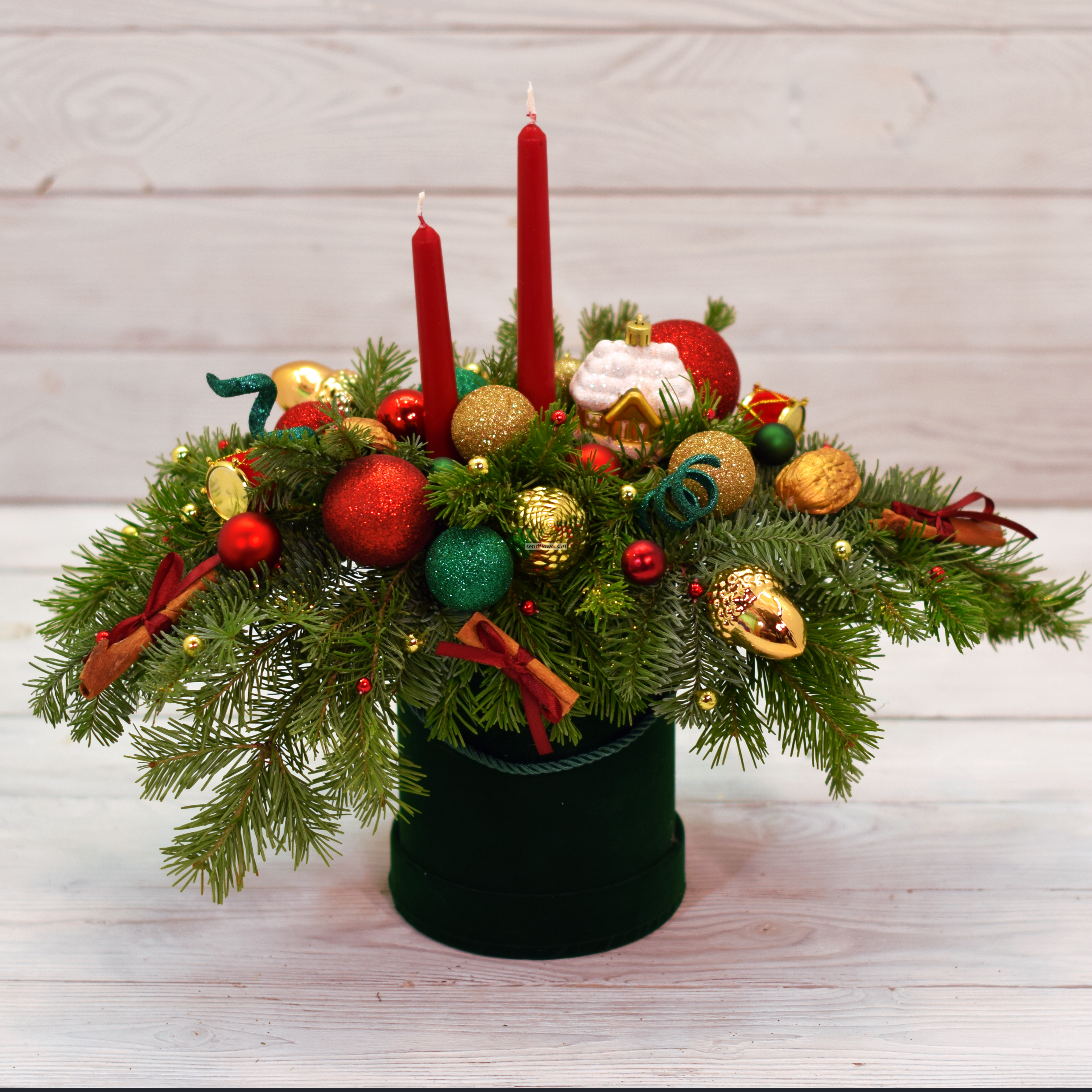 Шляпная бархатная коробка с еловой композицией и красными свечами. Размеры композиции: высота - 40 см, ширина 45 см. Высота указана вместе со свечами.
