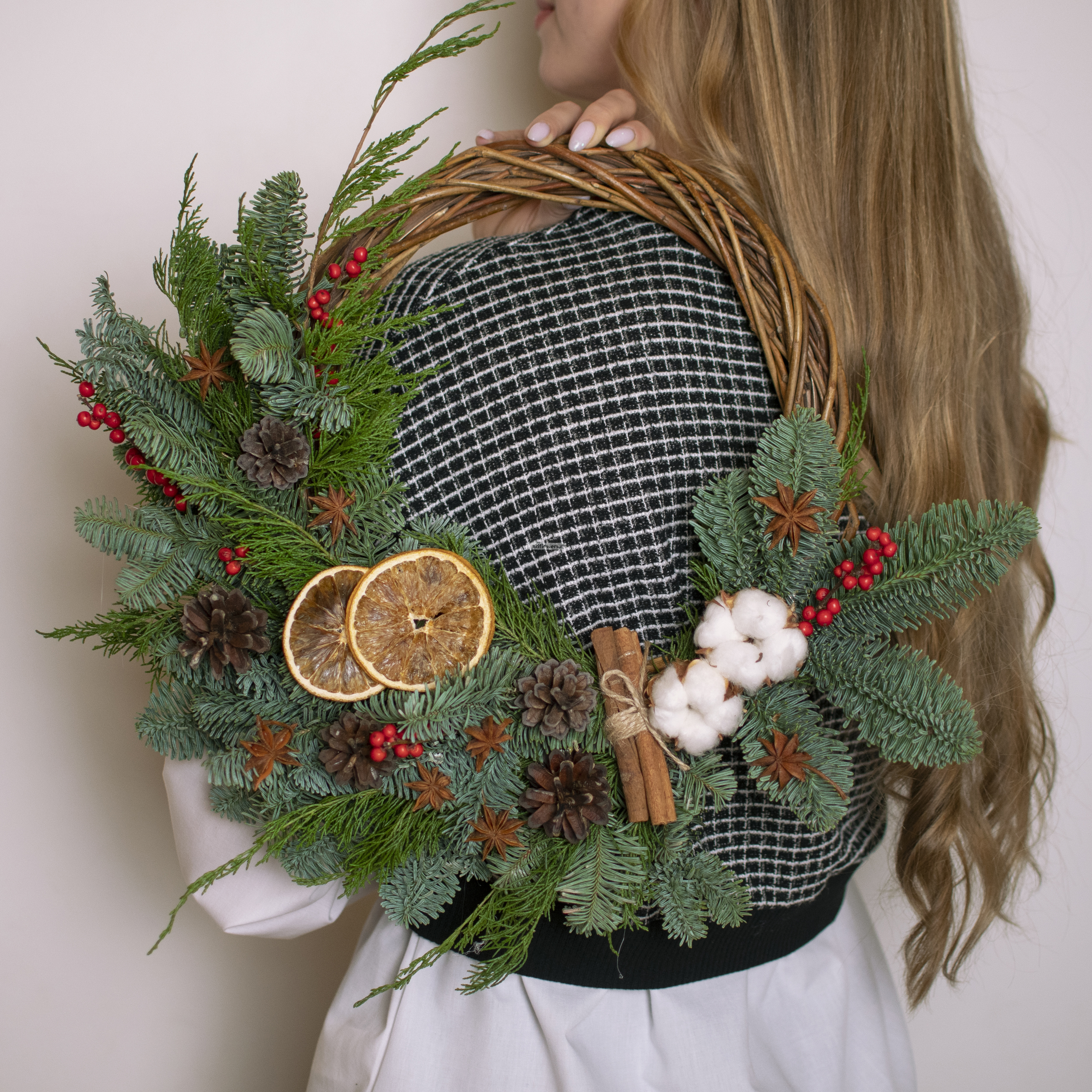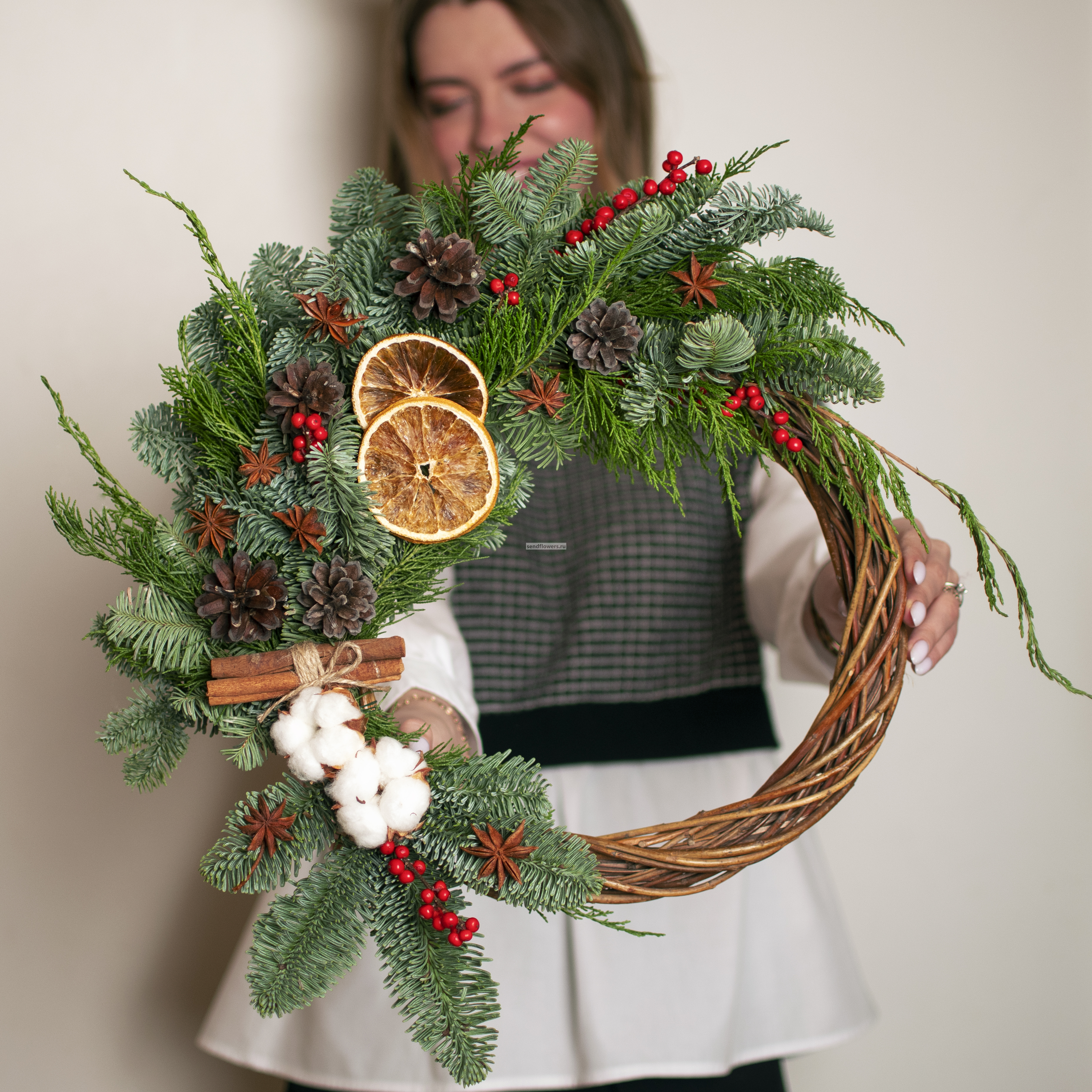 Состав: ветки Нобилис - 3 шт., Хлопок - 2 шт., Корица - 1 шт., Шишки - 5 шт., Анис - 8 шт., Илекс - 3 шт., Дольки апельсина сушеные - 2 шт. Размер: диаметр - 35 см.