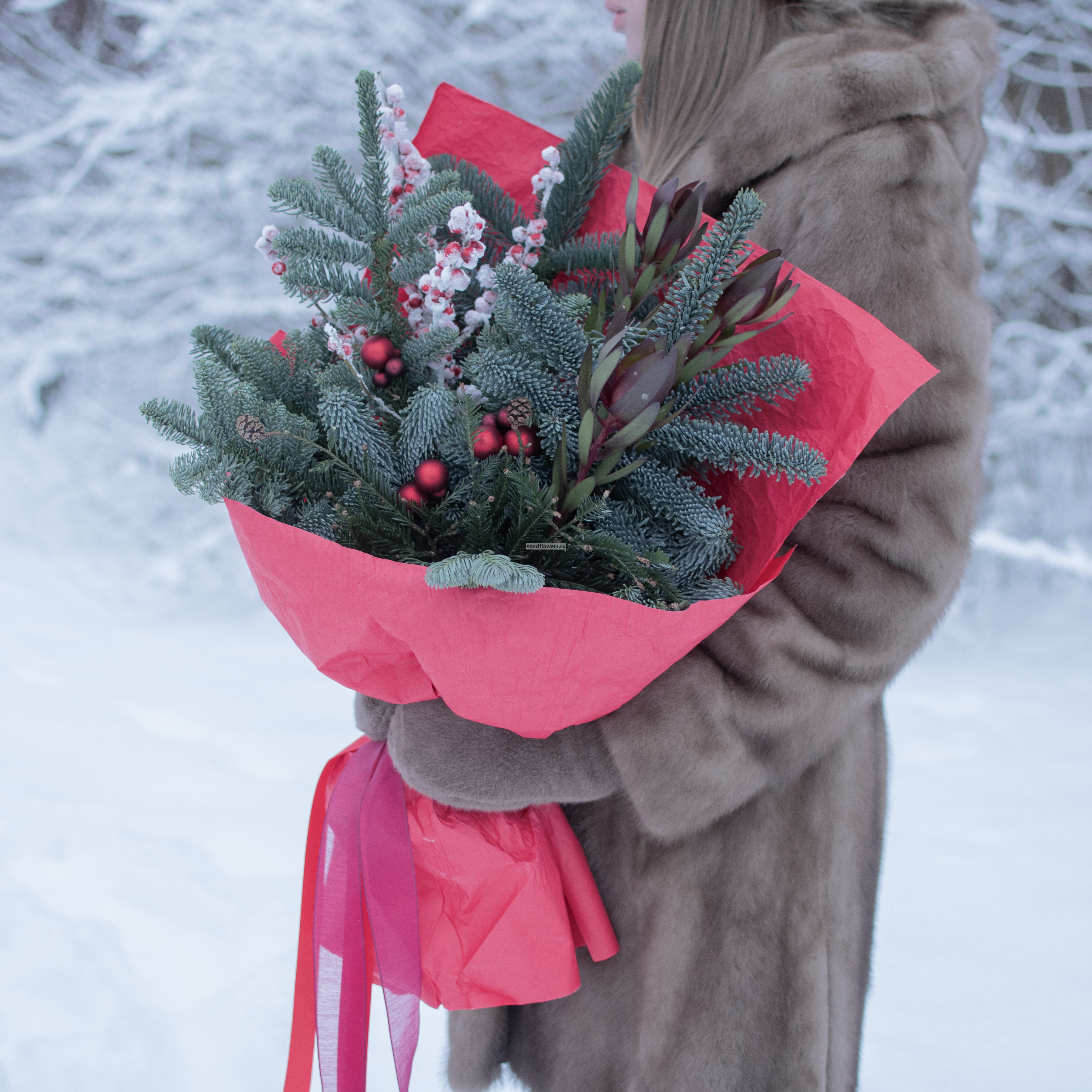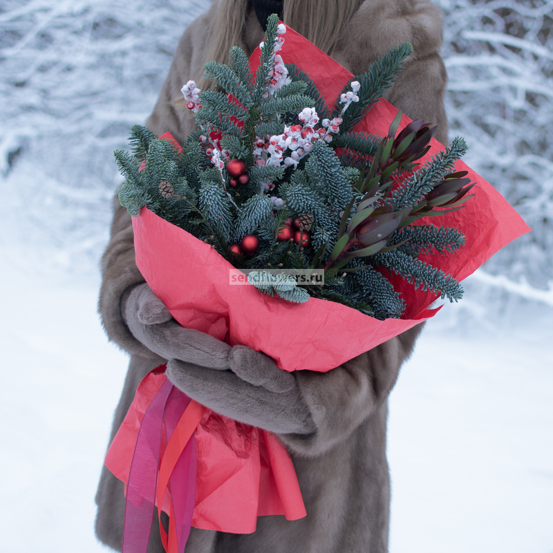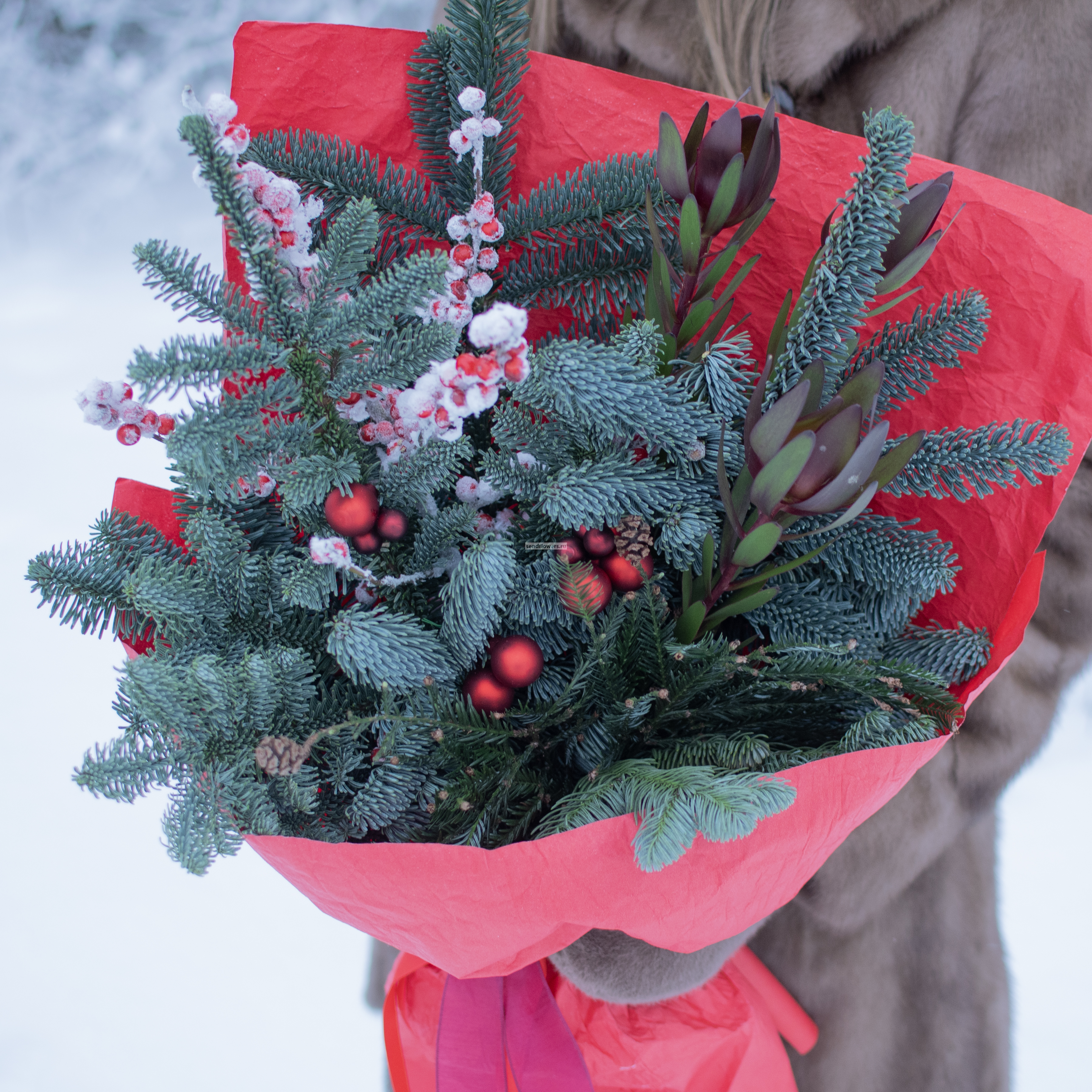 Состав: нобилис - 3 шт., сафари - 3 шт., илекс - 1 шт., хвойный микс - 1 шт., сосна - 3 шт. Декор: новогодние шары-мини - 7 шт., крафт. Размер: диаметр - 45см, высота - 45см.