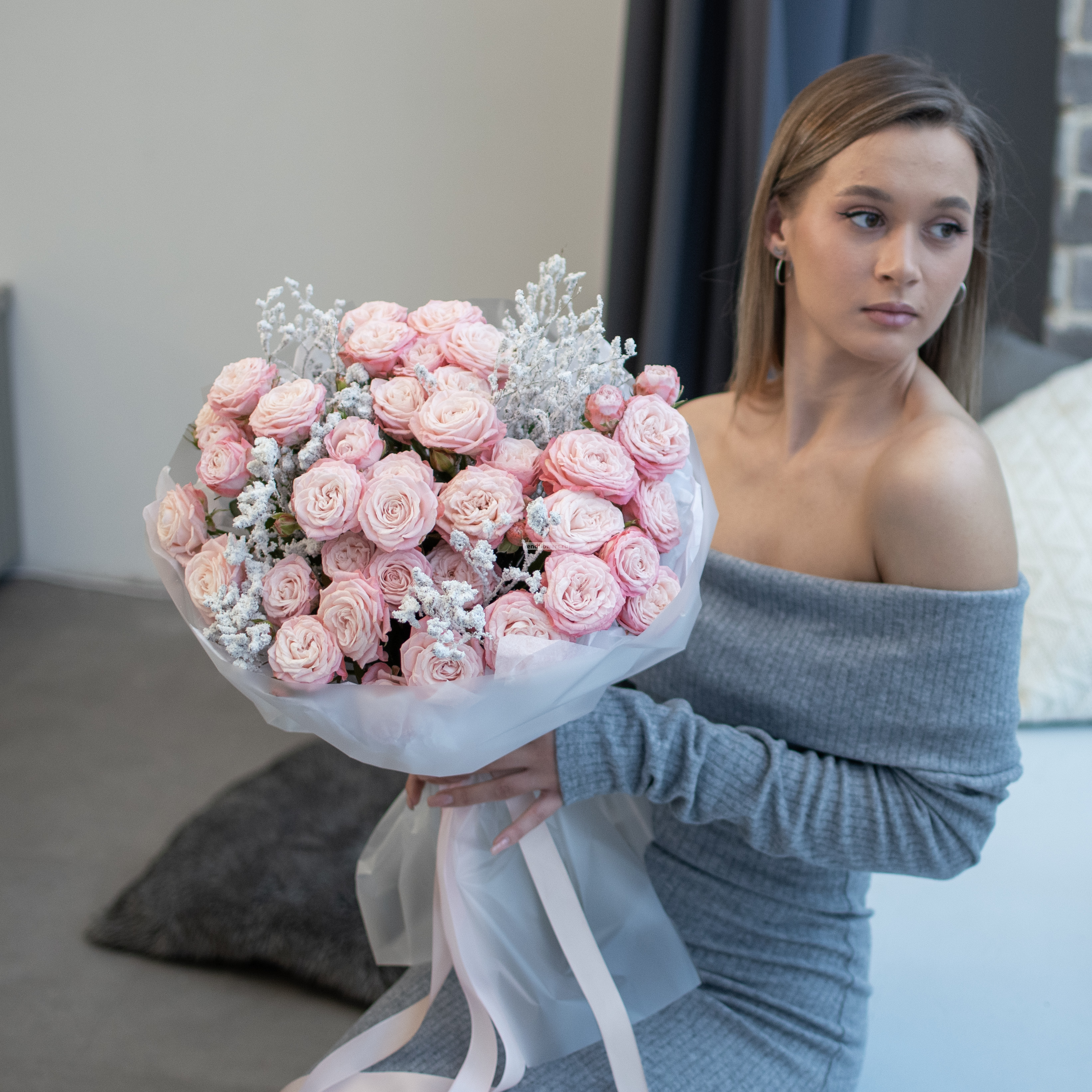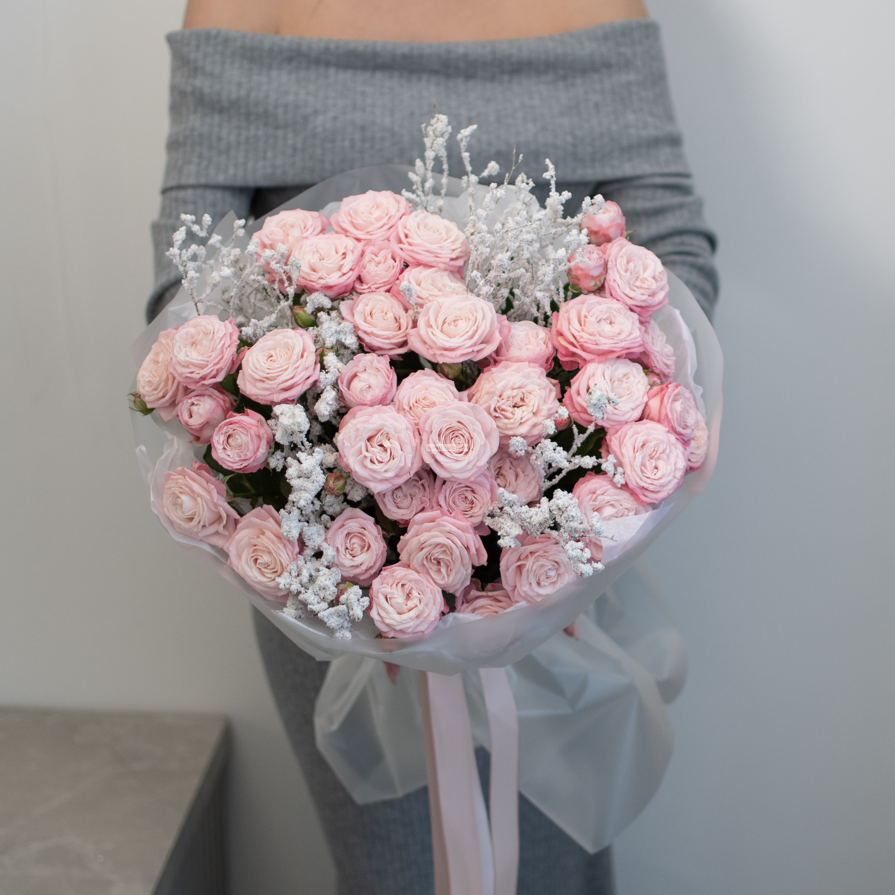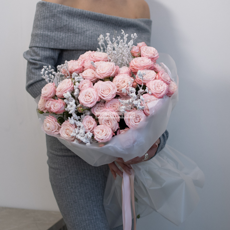 Состав: кустовая роза бомбастик - 7шт., черничник заснеженный - 4шт. Упаковка: тишь и матовая плёнка Размер букета: ширина - 40см., высота - 45см.