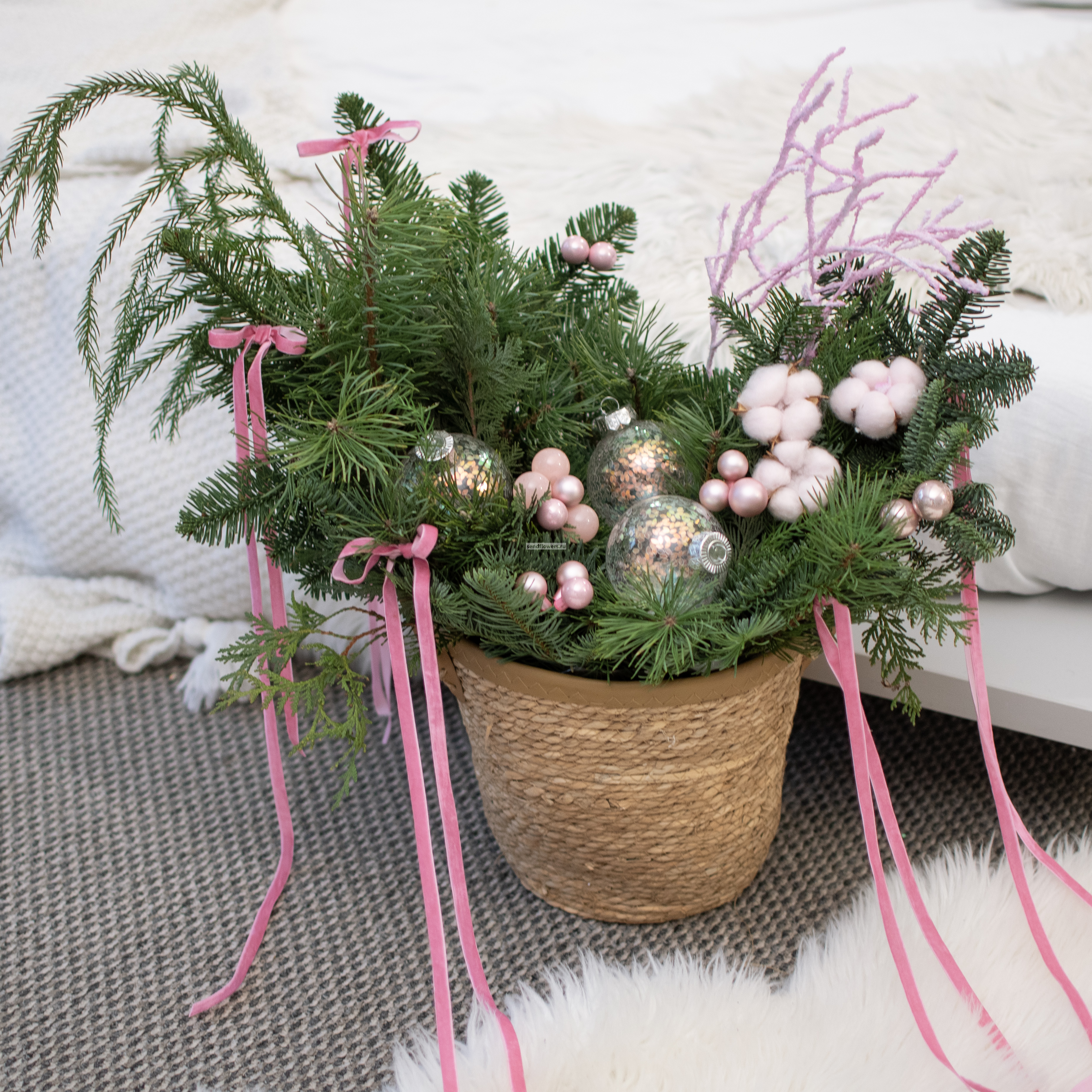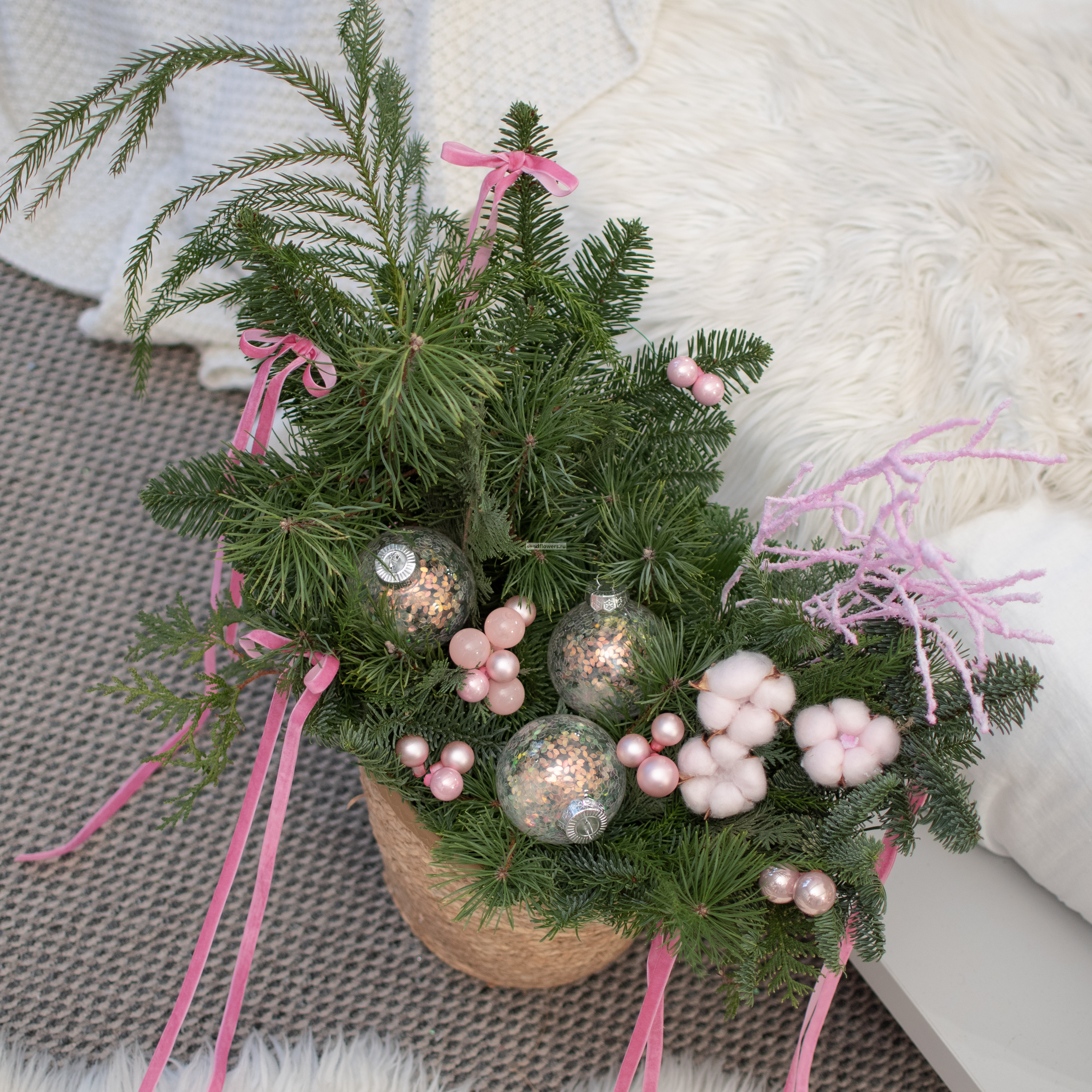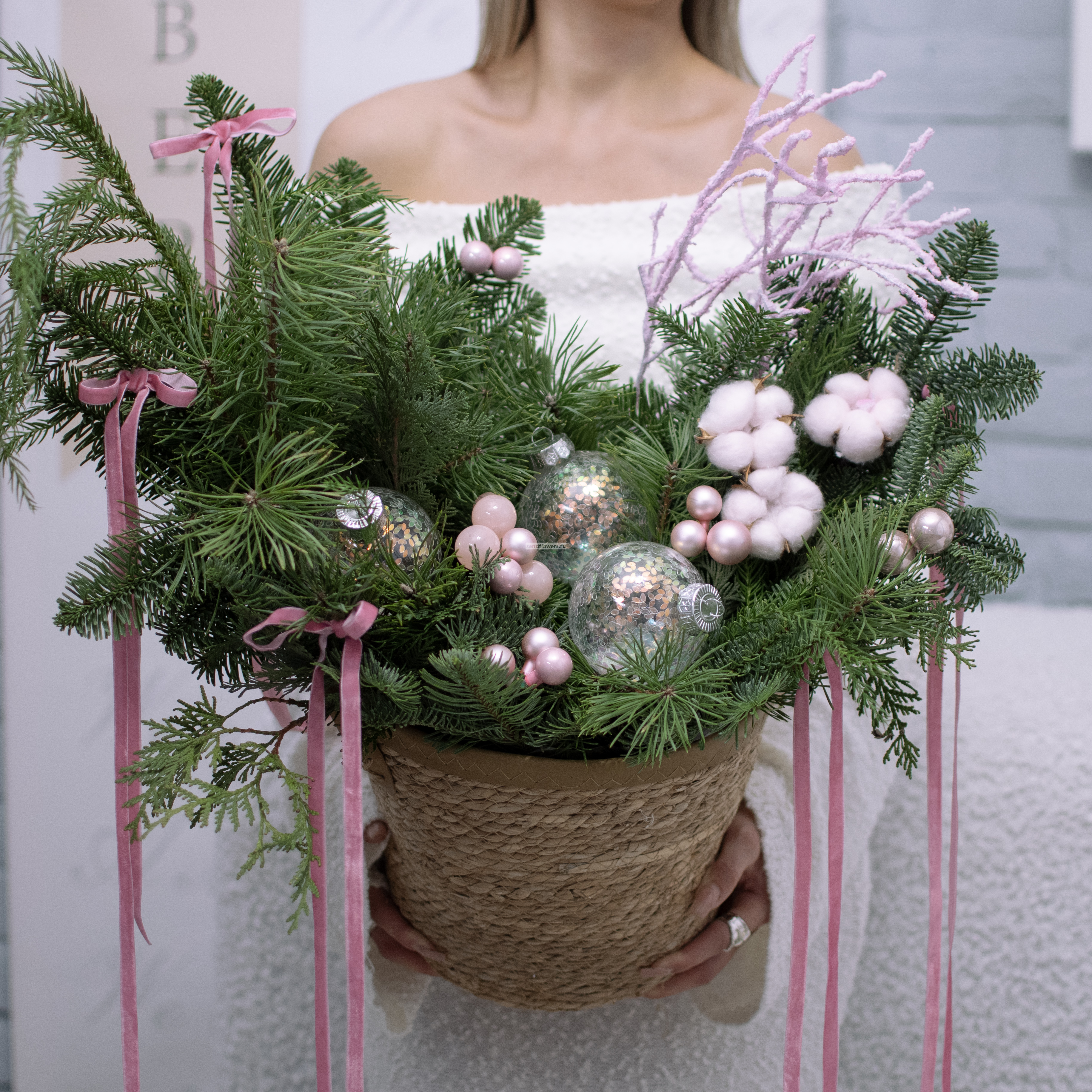 Композиция в плетеной корзине из нобилиса с хлопком, новогодними игрушками и бантамиРазмер композиции: ширина - 55см., высота - 55см.