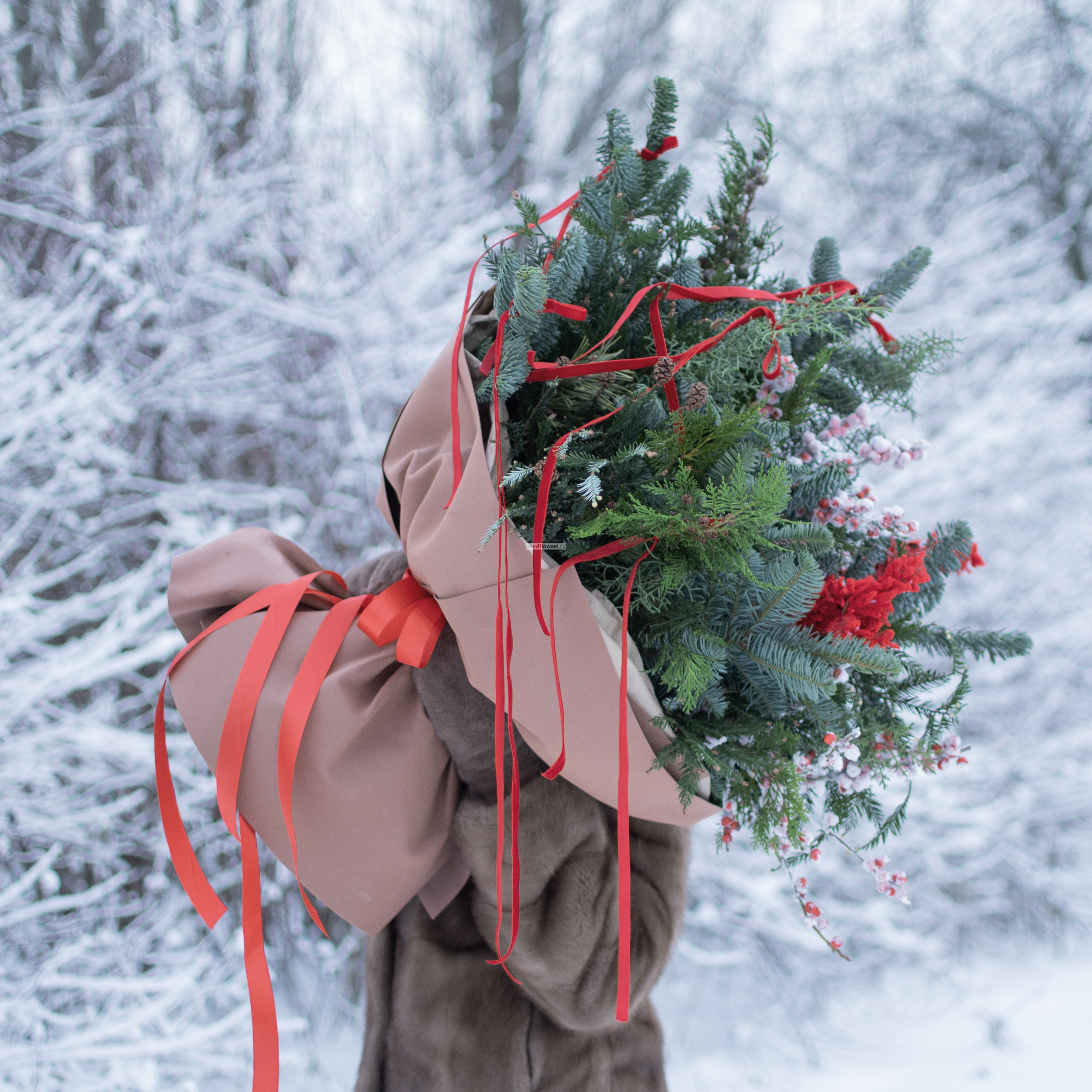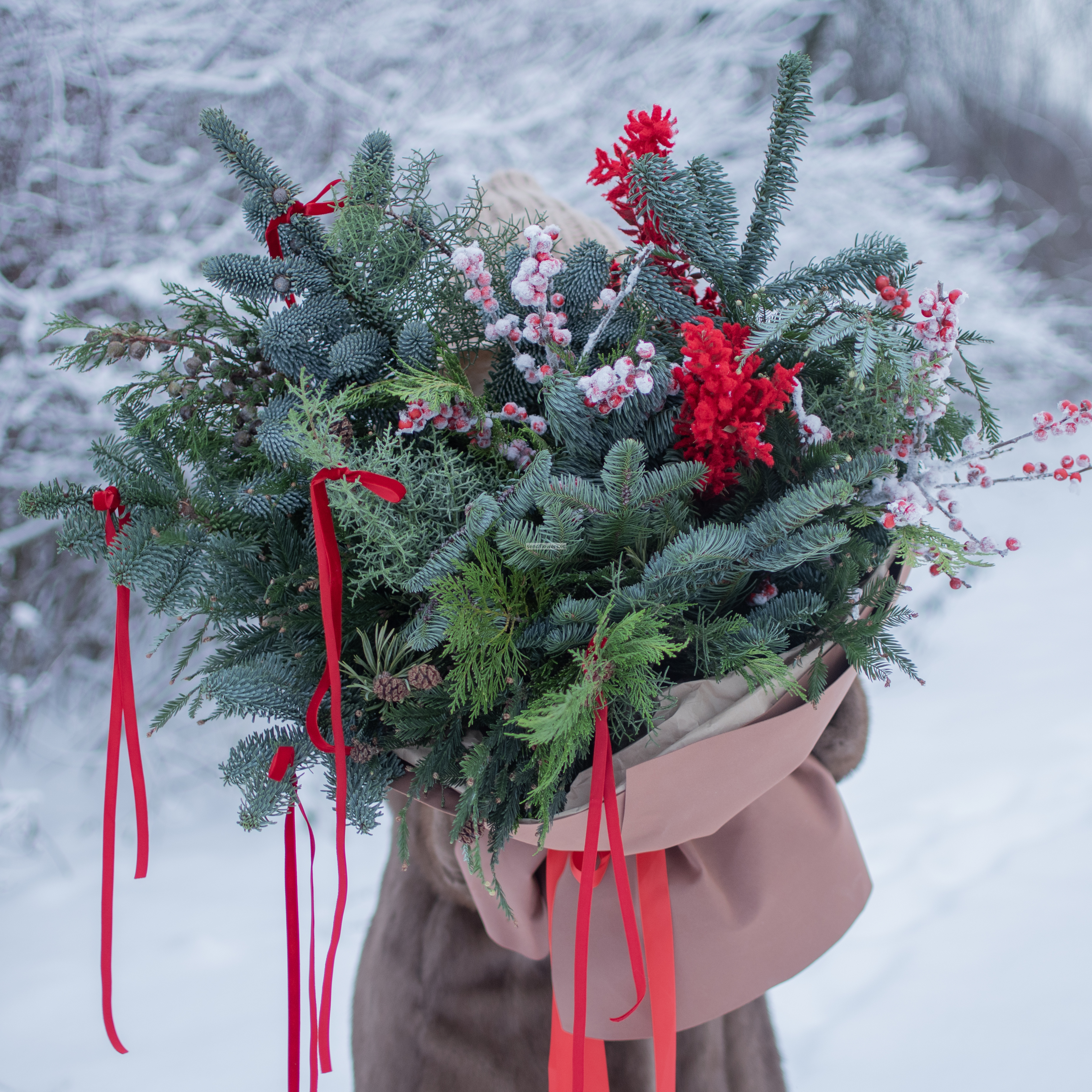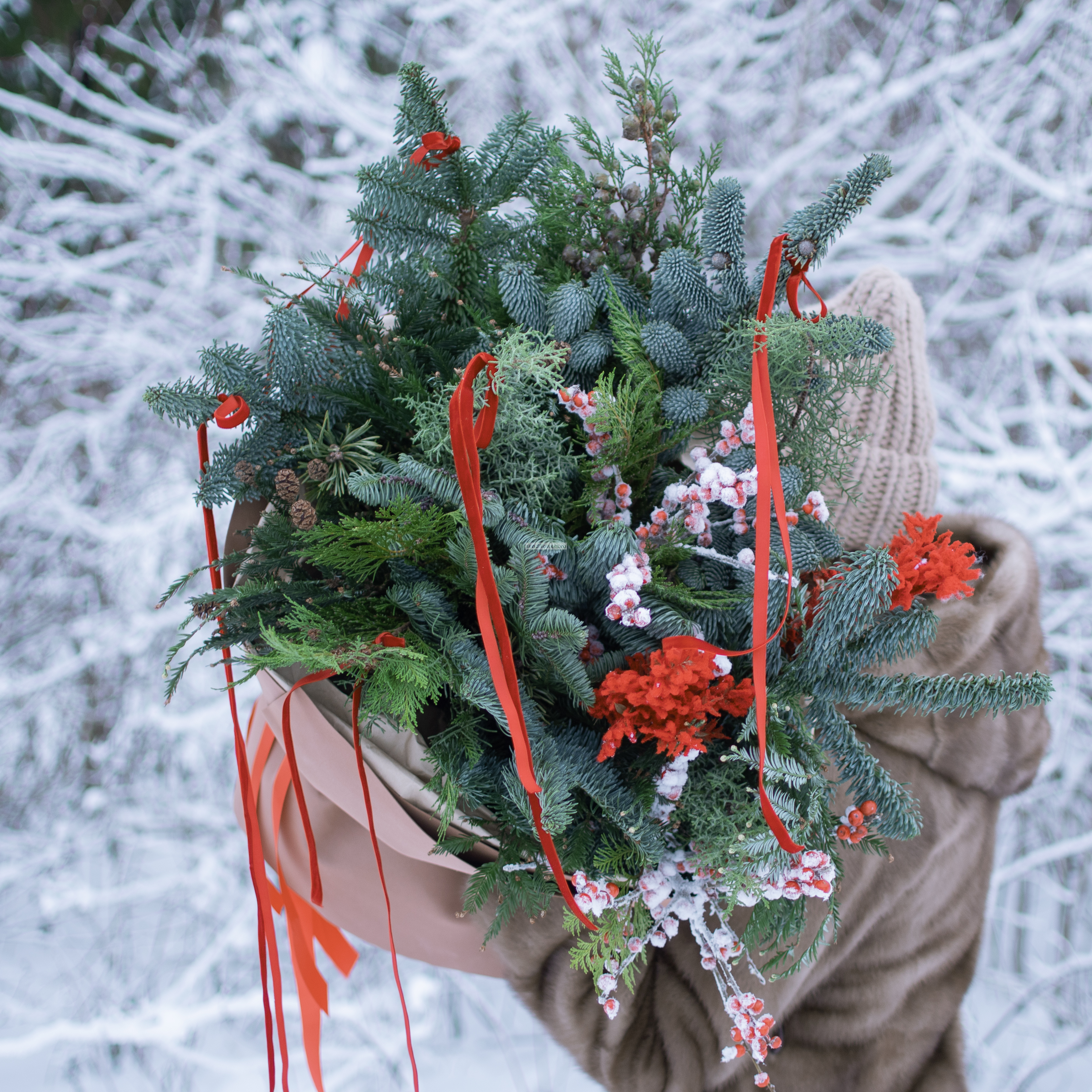 Состав: илекс - 2шт., нобилис - 5 шт., лапки заснеженные красные - 2 шт., хвойный микс - 7 шт., сосна - 3 шт. Декор: бархатные бантики, тишью, фоамиран. Размер: диаметр - 55см, высота - 60см.