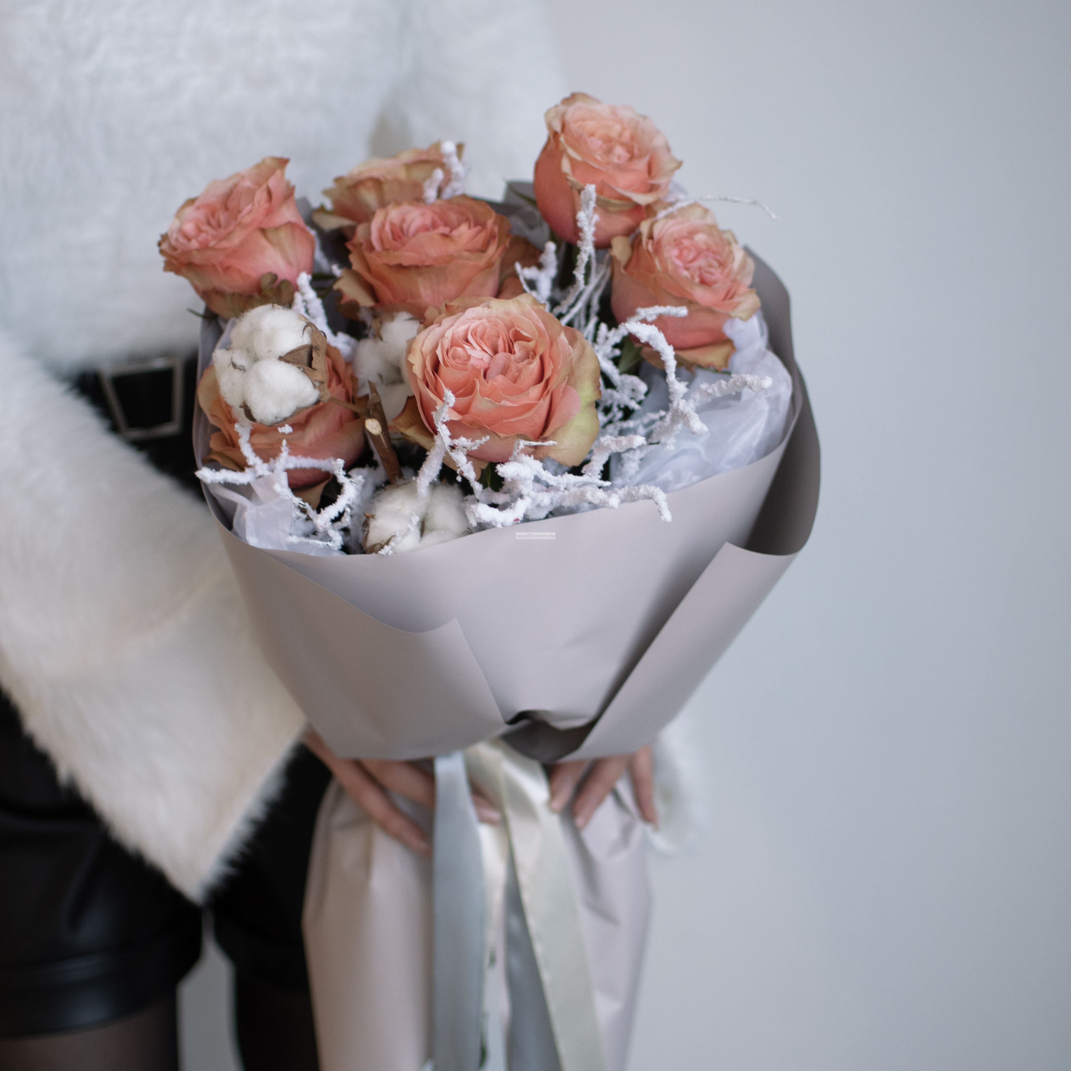 Состав: роза пионовидная кахала - 7шт., хлопок белый - 3 шт., заснеженный черничник Упаковка: тишью и матовая плёнка Размер букета: ширина - 25см., высота - 40см.