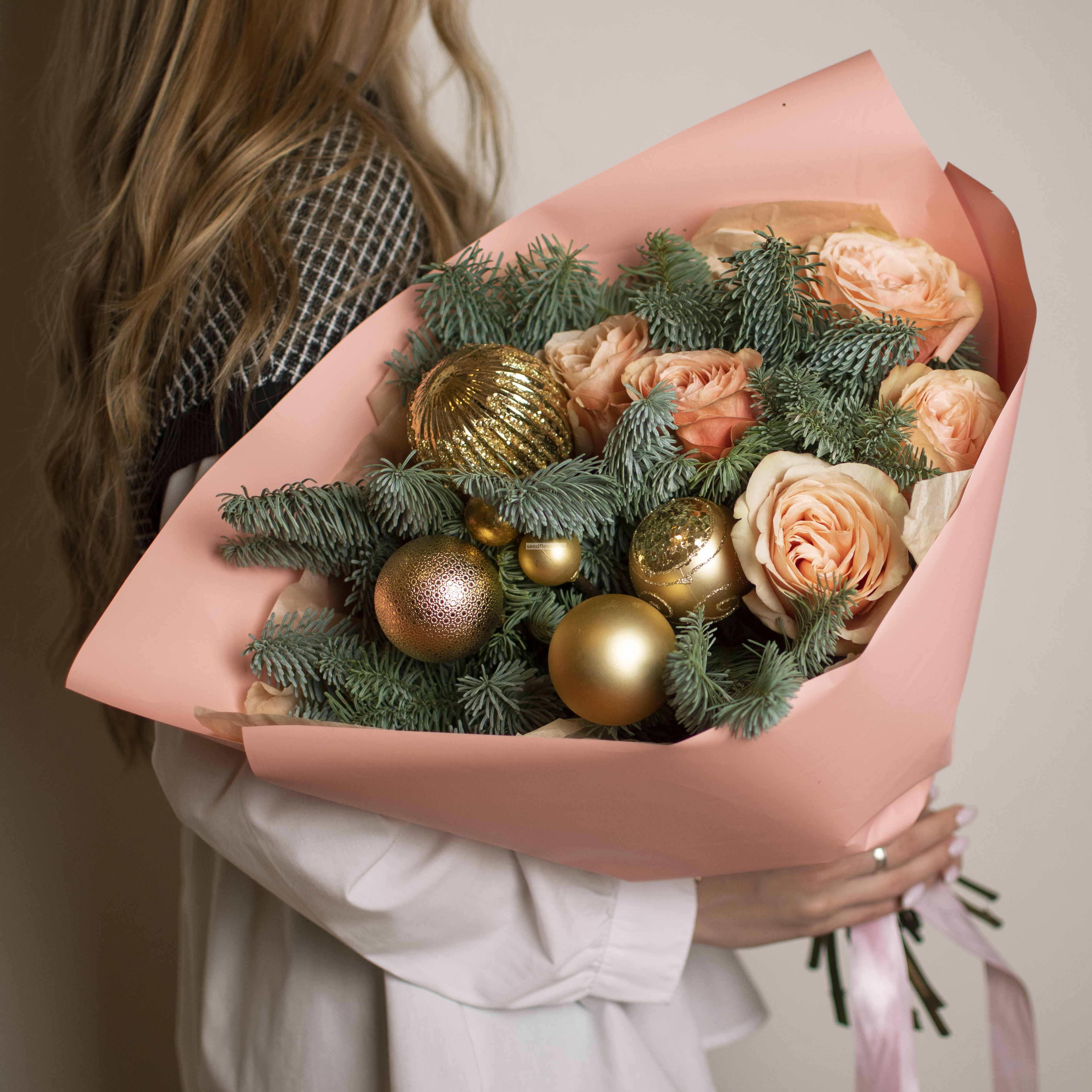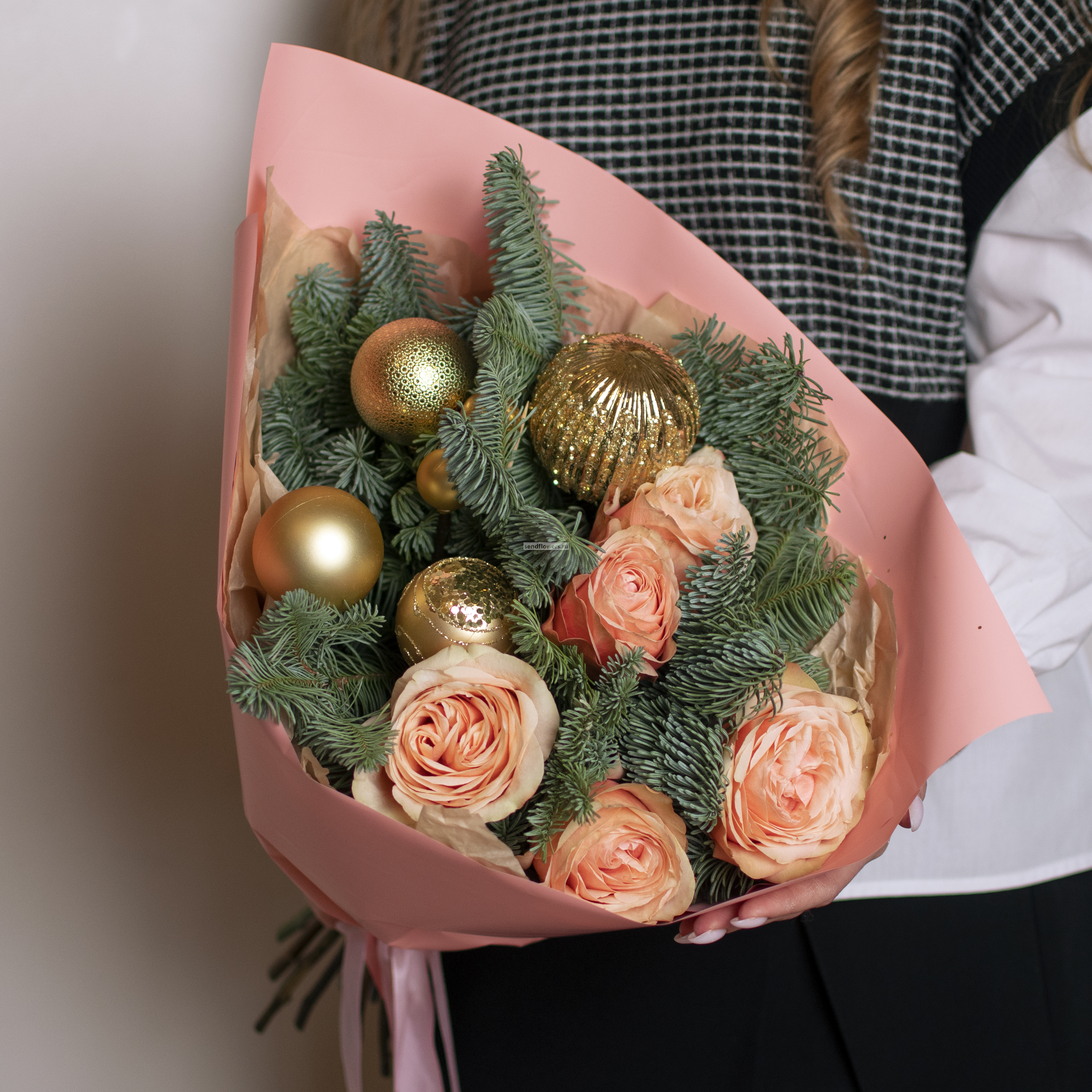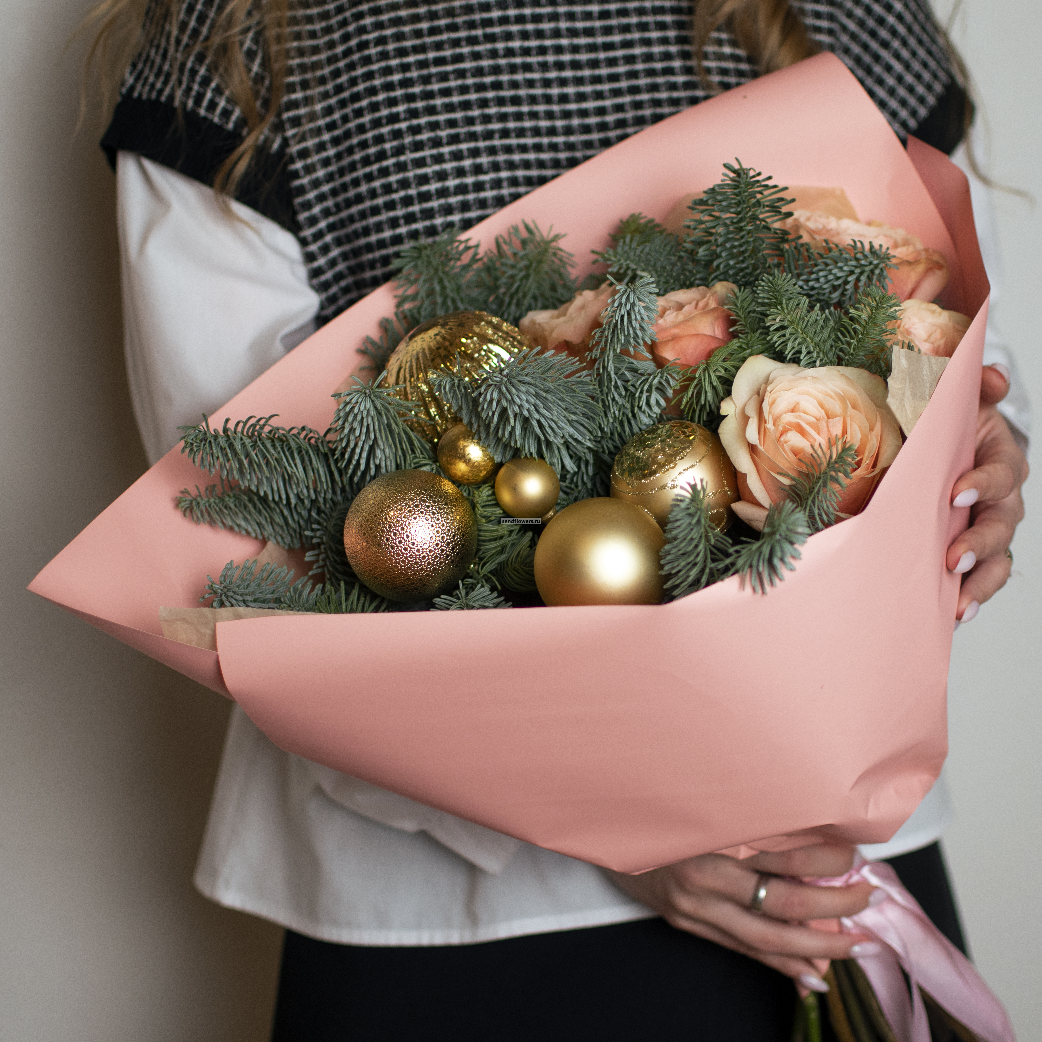 Состав: роза Кахала - 5 шт., шары Новогодние - 6 шт., елка Нобилис - 3 шт., Упаковка: тишью и матовая пленка. Размер: диаметр - 35 см, высота - 40 см.