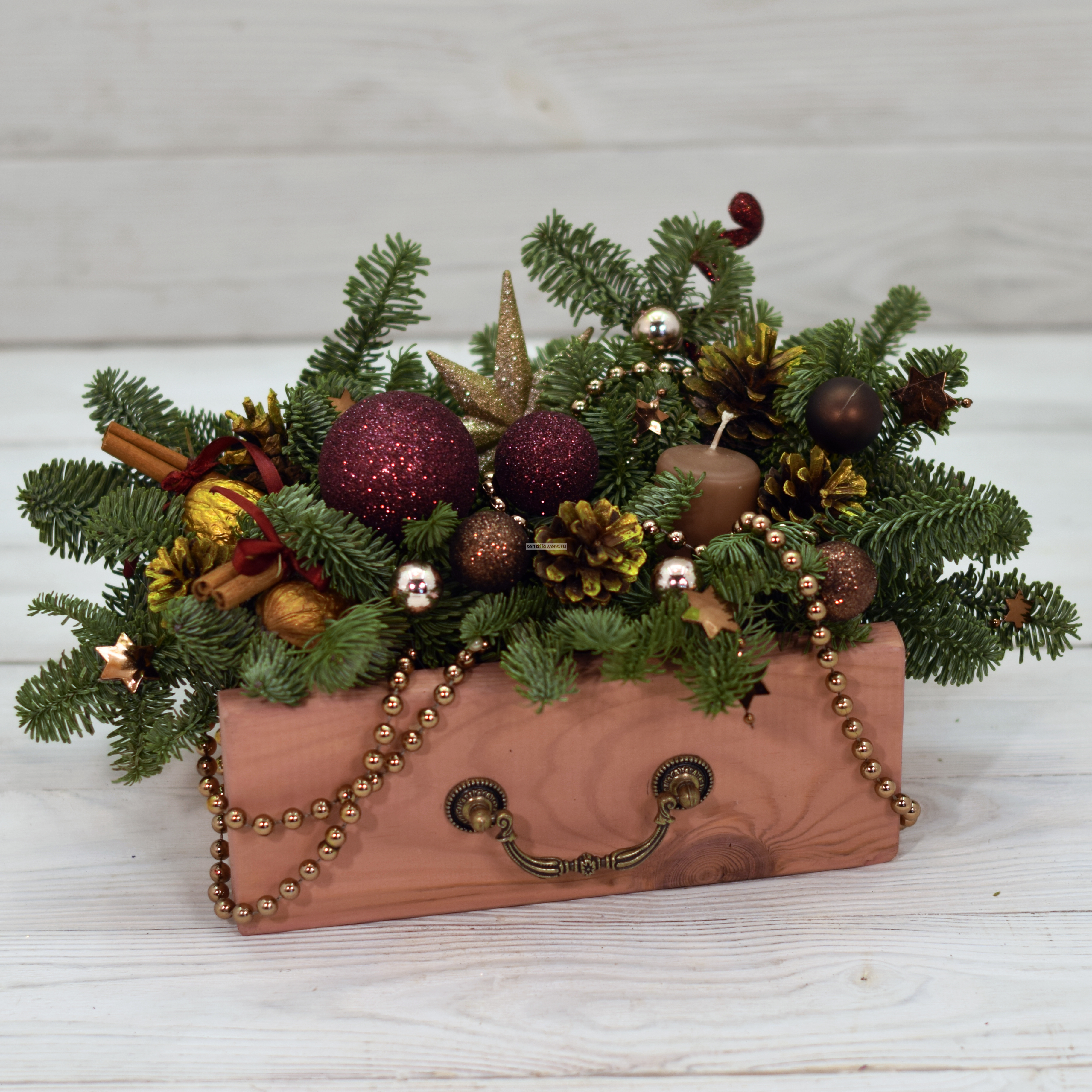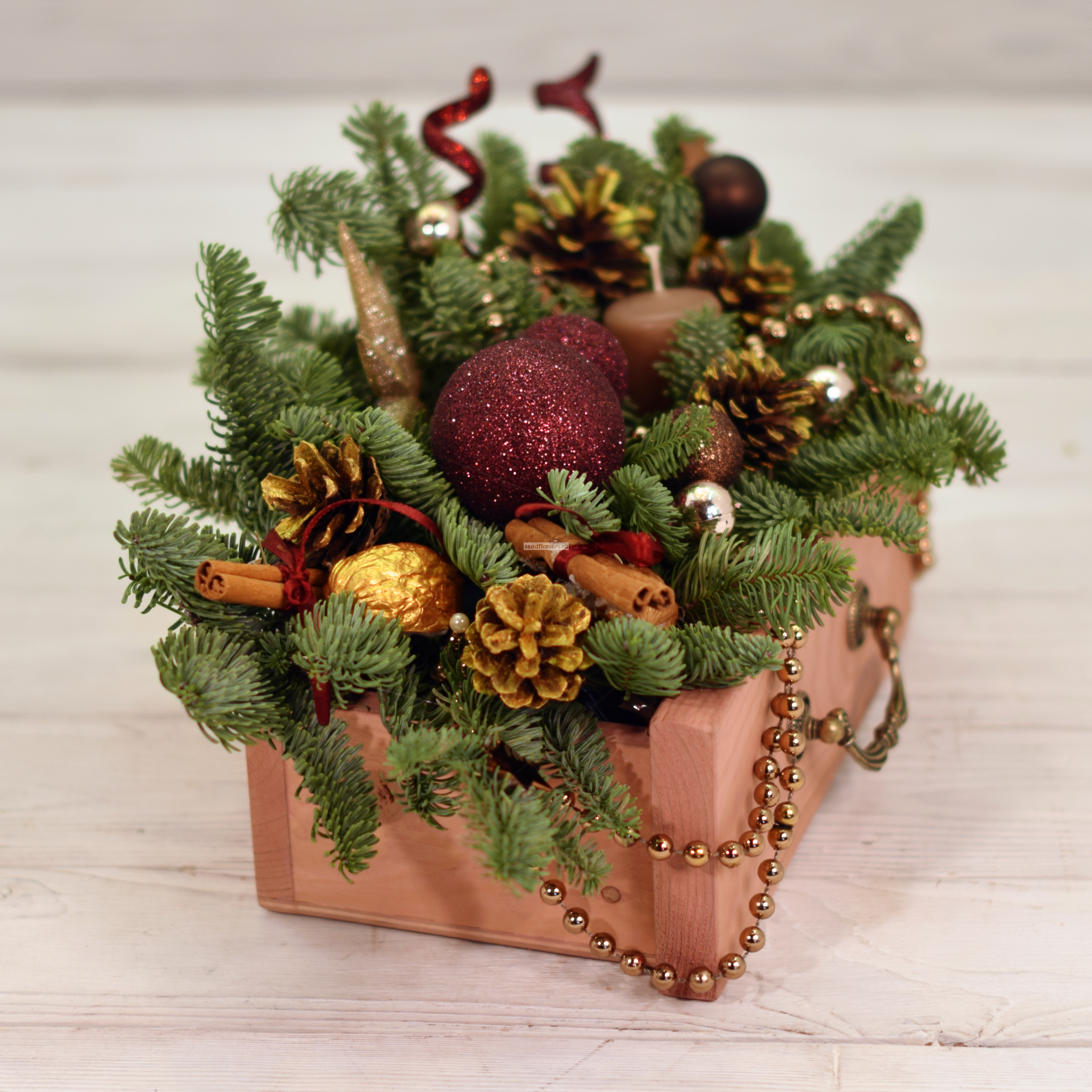 Состав: лапки ёлки Нобилис, шишки, корица, скорлупки грецкого ореха, ёлочные игрушки, свеча. Размер: высота - 15 см, ширина - 25 см.