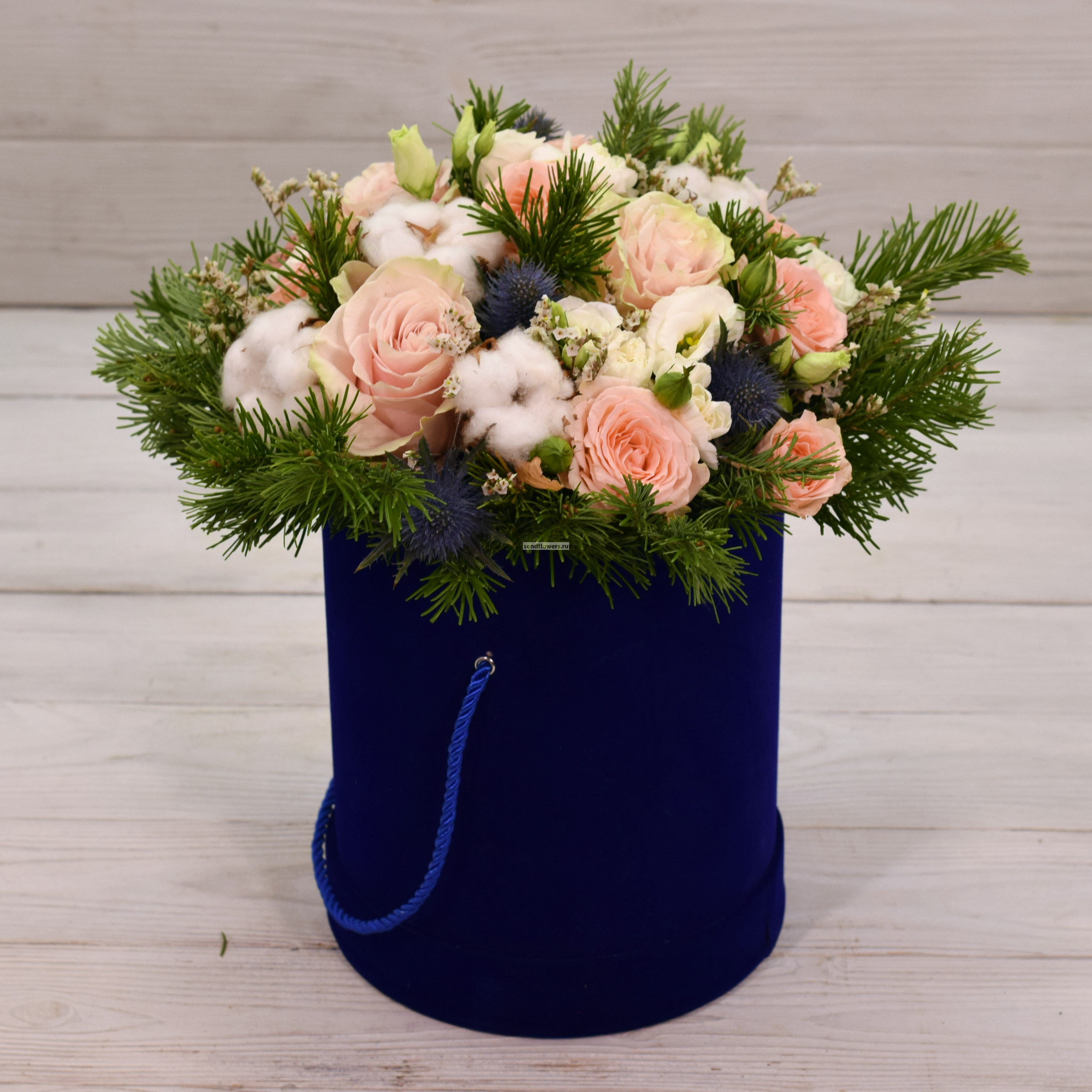 Состав: розы Pink Mondial- 3 шт., лапки пихты, кустовая роза Prana - 3 шт., белый лизиантус - 2 шт., кустовая гвоздика - 5 шт., эрингиум - 2 шт., хлопок - 5 шт., лимониум - 1 шт. Коробка: синий бархат, высота - 20 см, диаметр - 18 см.